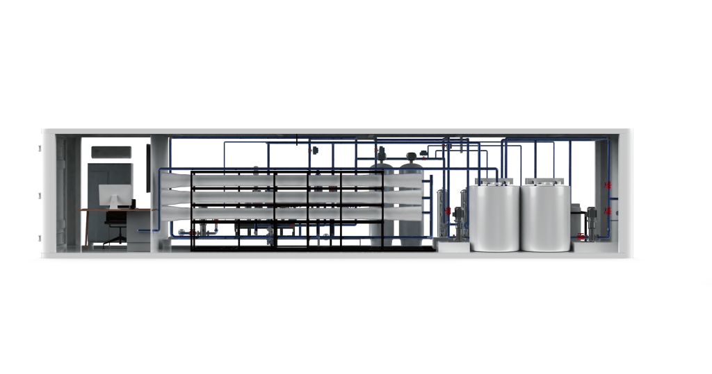 Dieses containerbasierte Meerwasserentsalzungssystem ist eine vollintegrierte, mobile Lösung zur Umwandlung von Meerwasser in hochreines Süßwasser. Die kompakte, in einem Schiffscontainer untergebrachte Einheit durchläuft typischerweise einen mehrstufigen Prozess: Zunächst erfolgt die Wasserentnahme und Vorfiltration zur Entfernung von Feststoffen und biologischen Bestandteilen, gefolgt von der Hochdruck-Umkehrosmose als zentralem Entsalzungsschritt. Oftmals werden dabei Energierückgewinnungsgeräte zur Optimierung der Effizienz eingesetzt. Das so gewonnene Süßwasser wird anschließend remineralisiert und desinfiziert, um sicherzustellen, dass es die strengen Standards für Trink- und Brauchwasser erfüllt. Das robuste und modulare System ist für den schnellen Einsatz und den autonomen Betrieb konzipiert und bietet eine zuverlässige, skalierbare Süßwasserquelle für Küstenindustrien, abgelegene Gemeinden und Katastrophenschutzprojekte.