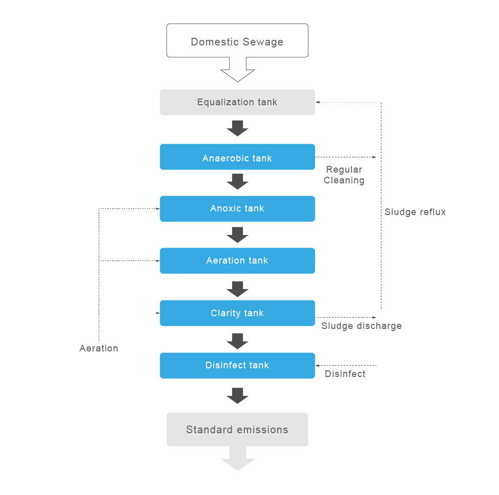 Das System nutzt moderne Techniken durch die Kombination von anaerob-anoxisch-oxischen (AAO) Prozessen mit der MBBR-Technologie (Moving Bed Biofilm Reactor). Diese leistungsstarke Kombination maximiert die Entfernung organischer Schadstoffe und Nährstoffe. Dadurch entspricht das gereinigte Abwasser stets den strengen Einleitungsstandards und schützt so die lokale Umwelt. Dieses fortschrittliche biologische Verfahren gewährleistet einen zuverlässigen Betrieb des Systems auch unter den schwankenden Belastungsbedingungen, die in dörflichen Unterkünften und touristischen Attraktionen häufig auftreten.