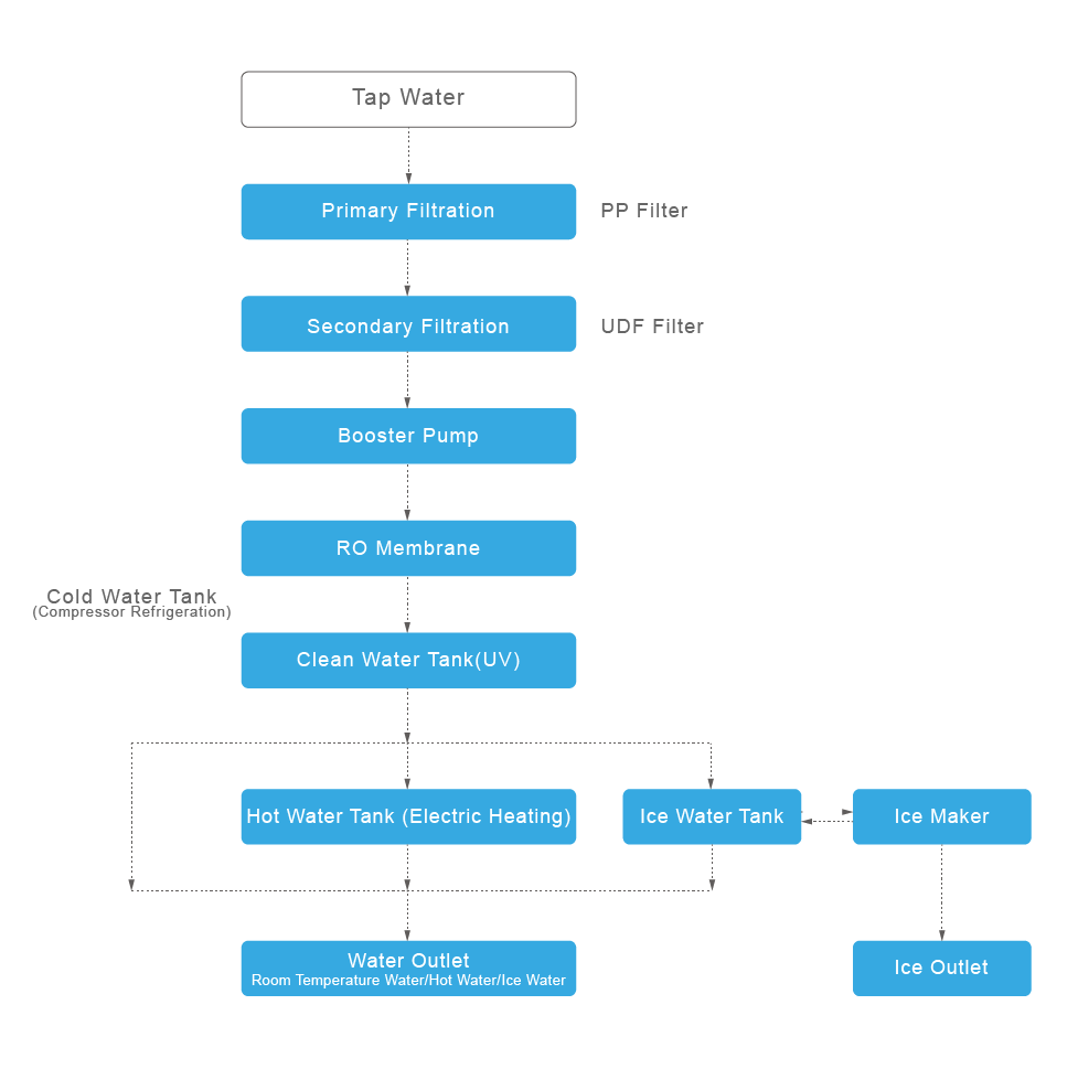 Dieser vertikale Wasserspender verfügt über ein zweistufiges Filtersystem, wobei jede Stufe einen bestimmten Reinigungsgrad bietet. Zusätzlich ist er mit einem Umkehrosmose-Membranmodul ausgestattet. Die Filter arbeiten zusammen, um das Wasser durch mehrere Schichten zu leiten und es so in sicheres, trinkfertiges Wasser zu verwandeln. Das Gerät liefert auf Knopfdruck heißes, kaltes oder zimmerwarmes Wasser. Außerdem bietet es eine Doppelfunktion zur Eiswürfelherstellung oder zur Zubereitung von Sprudelwasser und ist somit vielseitig einsetzbar.