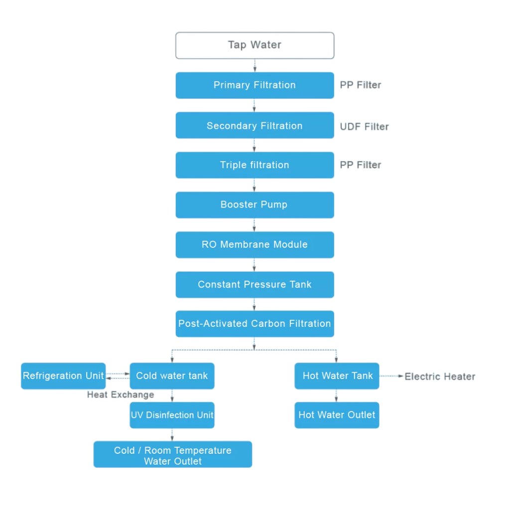 Dieser vertikale Wasserspender verfügt über ein dreistufiges Filtersystem, in dem jede Stufe Verunreinigungen unterschiedlich gründlich herausfiltert. Zusätzlich ist er mit einer Umkehrosmosemembran für eine noch gründlichere Reinigung ausgestattet. Durch diesen mehrstufigen Filtrationsprozess wird Leitungswasser in sauberes und sicheres Trinkwasser verwandelt. Das Gerät liefert Ihnen jederzeit heißes, kaltes oder zimmerwarmes Wasser.
